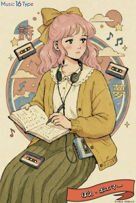 ぽえ・ポエマーは、音楽を通して感情のつながりを確かめるタイプ。音楽の中のメッセージやストーリーに心を重ね、誰かの想いを自分のことのように感じ取る事ができる。歌詞の一行に共感を覚えると、誰かの気持ちや過去の出来事が自然に浮かび上がり、心の奥でそっと共鳴する。大げさな盛り上がりよりも、共感し合い、微笑み合う瞬間に価値を感じる。ぽえ・ポエマーにとって音楽とは、心を落ち着かせ、他者とつながるための柔らかな媒介である。 ──音楽は心の会話であり、共鳴の手紙。