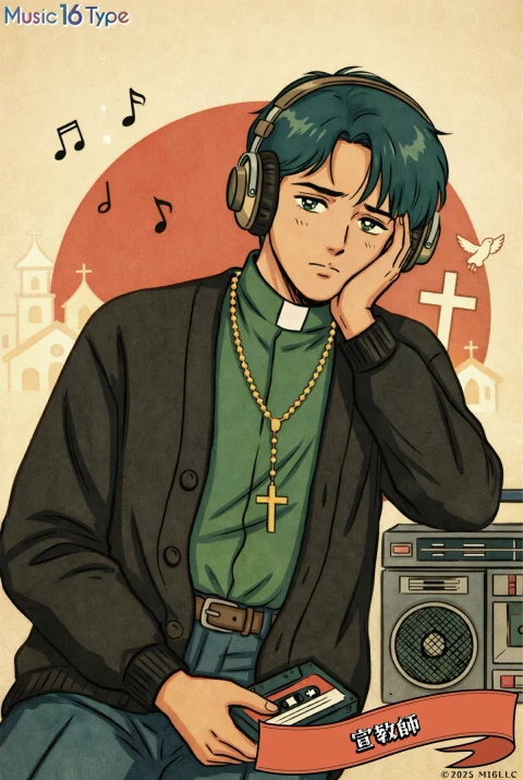 宣教師タイプは、音楽に"可能性"を見出し、その魅力を人に伝える使命感を持つタイプ。静かな音中に"おお?"っと気づきを起こし、歌詞より音の景色にワクワクする。誰よりも早く新しいアーティストを見つけ、仲間に広めたくなる。布教は押し付けず、日常にそっと忍ばせる。沼へ誘い、王道の隣にある意外性をそっと渡す。派手なリアクションより"じわ効き"を愛し、翌週の再生回数でニヤリ。 ──音楽は、信念であり、布教すべき希望。